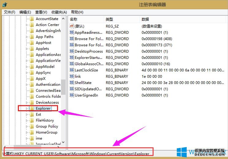 3、进入注册表编辑器之后点击左侧栏依次展开HKEY_CURRENT_USER\Software\Microsoft\Windows\CurrentVersion\Explorer。